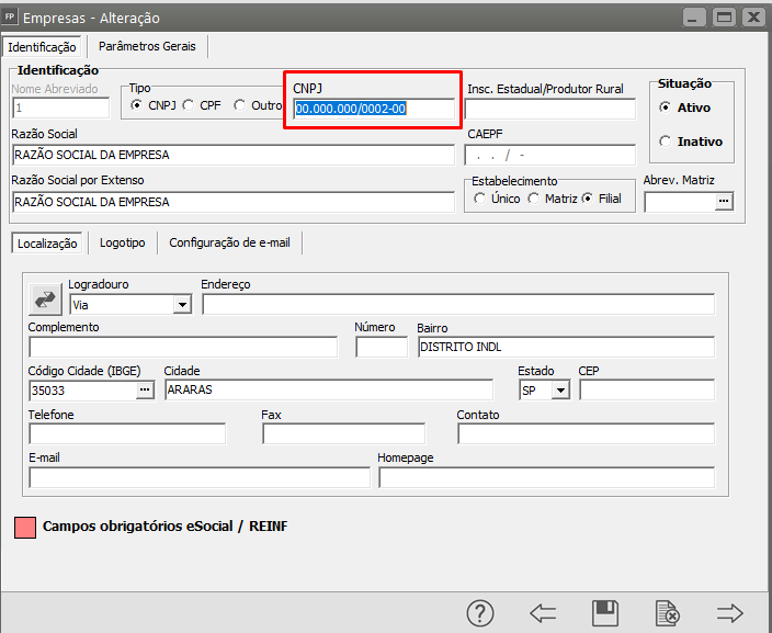 Ação Sugerida: Conferência do CNPJ informado no cadastro