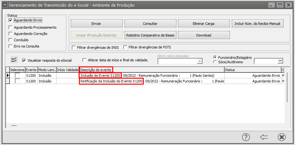 Ação Sugerida: Deverá existir um Evento já recebido, "Ativo" (não excluido ou retificado) com número de recibo de entrega igual ao informado no campo. Ou seja, o evento de retificação buscará pelo número de recibo do evento enviado anteriormente e concluido com sucesso através do recibo atual no modo inclusão. Caso o evento s1200 - Remuneração no modo inclusão estiver aguardando envio deverá eliminar o s1200 em retificação e enviar somente a carga em modo inclusão. Para identificar os eventos/cargas verifique a descrição: