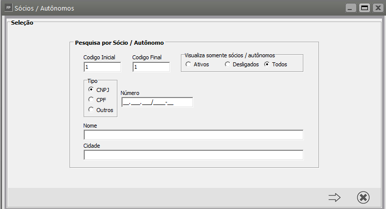 Correção: Acesse o menu Manutenção > Sócios/ Autônomos > Manutenção, pesquise pelo Código do Sócio e clique na seta Avança.