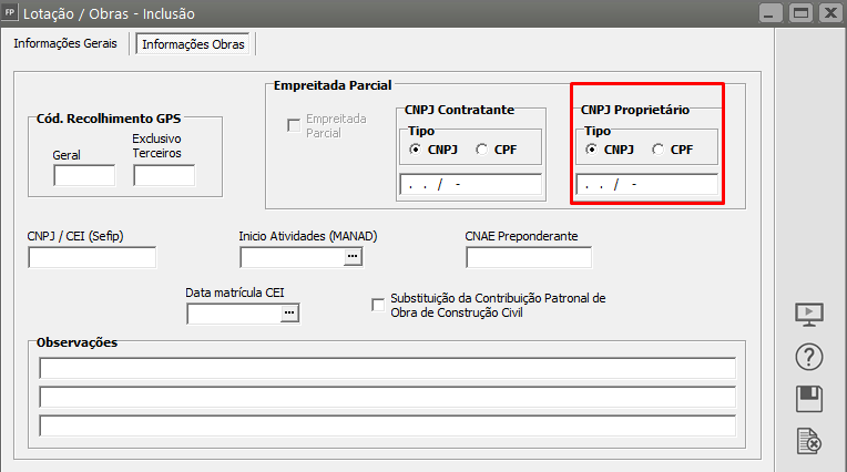 Ação Sugerida: Informar o CNPJ do Proprietário da Obra no cadastro da Obra