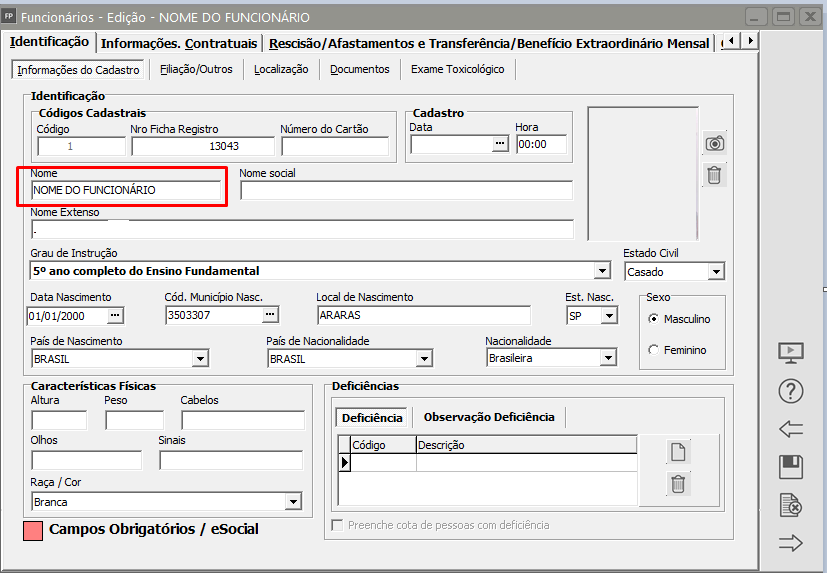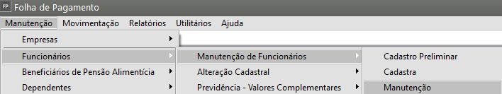 Correção: Acesse o menu Manutenção > Funcionários > Manutenção de Funcionários > Manutenção