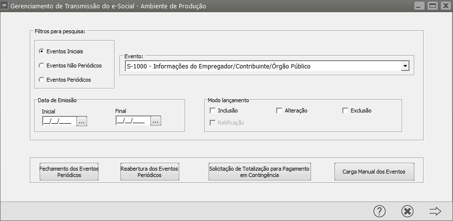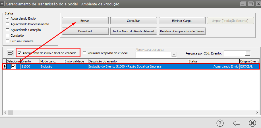 Em seguida acesse o Gerenciamento de Transmissão do eSocial e filtre por Eventos Iniciais - S1000 e clique na seta Avança