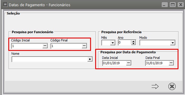 Pesquise pelo número do funcionário e no campo Pesquisa por Data de Pagamento informe o dia inicial e final do mês que está apresentando o erro.