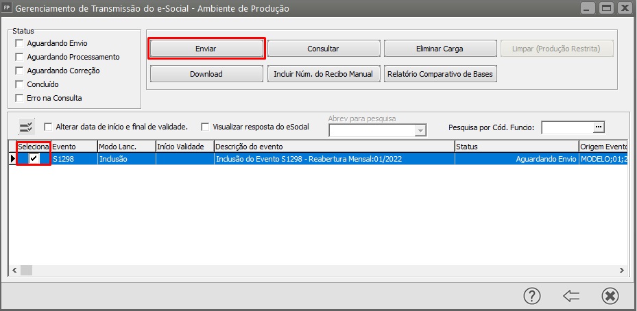 - Envie a carga s1298 que foi gerada, para Reabertura dos Eventos Periódicos. E repita esse processo em todos os meses que precisarão ser reabertos.