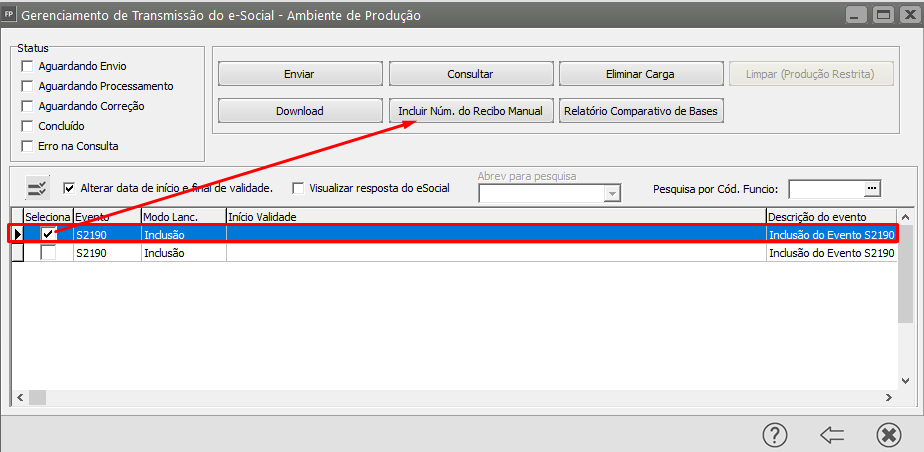 Em seguida- selecione o evento que está sendo rejeitado pelo eSocial e clique em incluir número de recibo manual
