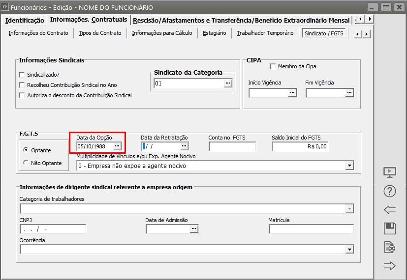 Em seguida acesse aCadastro aba Sindicato/Geral>FGTS e confirme se a data da opção ao FGTS está igual ou maior que 05/10/1988