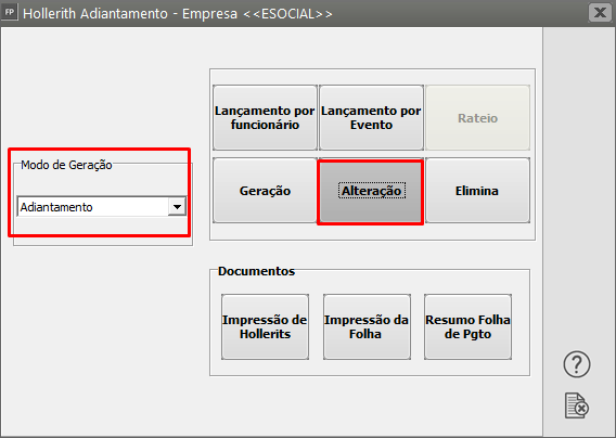 Correção: Acesse o menu Movimentação > Rotinas Mensais :> Holleriths de Funcionários > Geração, clique em OK e defina Modo de Geração Adiantamento