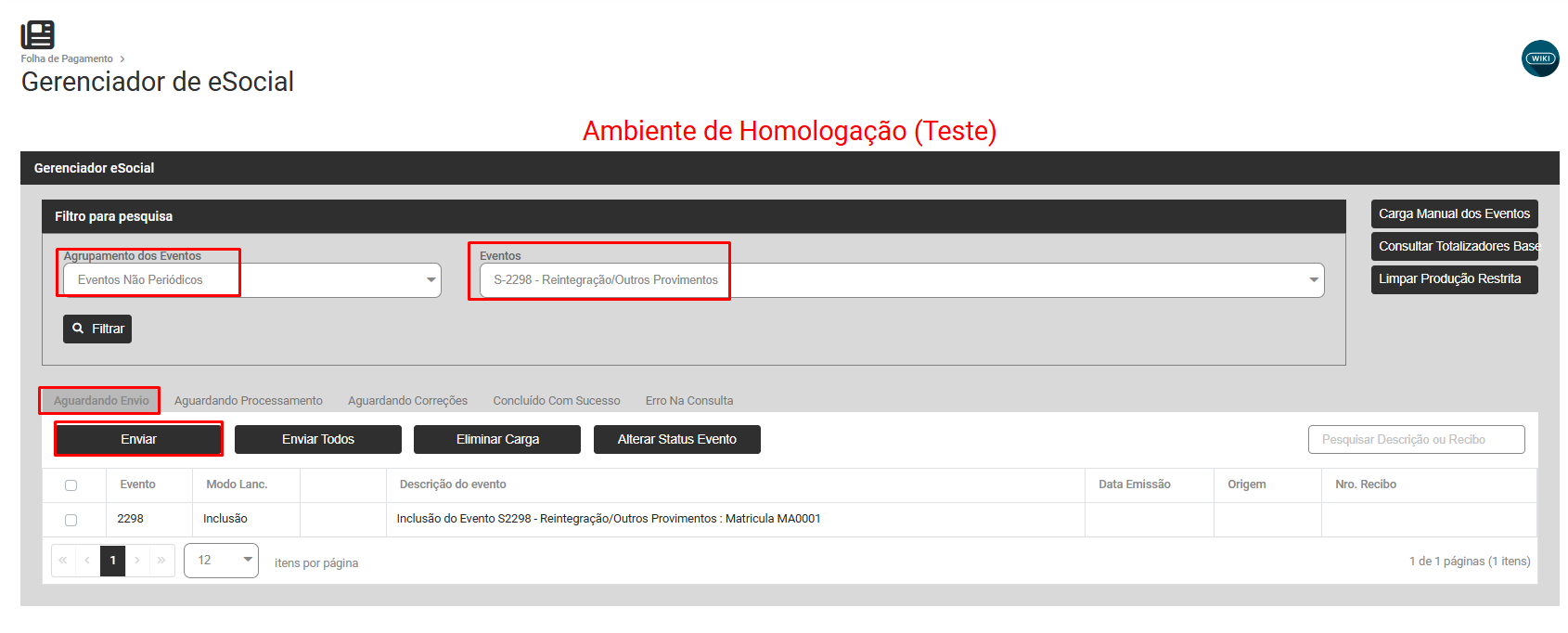 Filtre por Eventos Não Periódicos - S2298 acesse Aguardando Envio, defina o evento e faça o envio para o Portal do eSocial