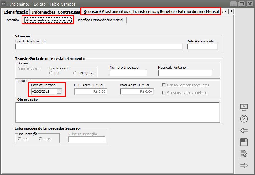 Acesse a aba ‘Rescisão/AfastamentosCadastro e Transferência/Benefício Extraordinário Mensal>Afastamentos e Transferência’Geral e verifique a ‘Data de Entrada’ informada’:
