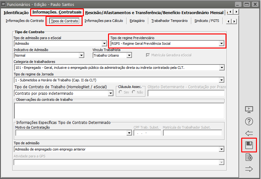 Verifique a informação preenchida no campo "Tipo de regime Previdenciário" > faça o ajuste necessário > salve