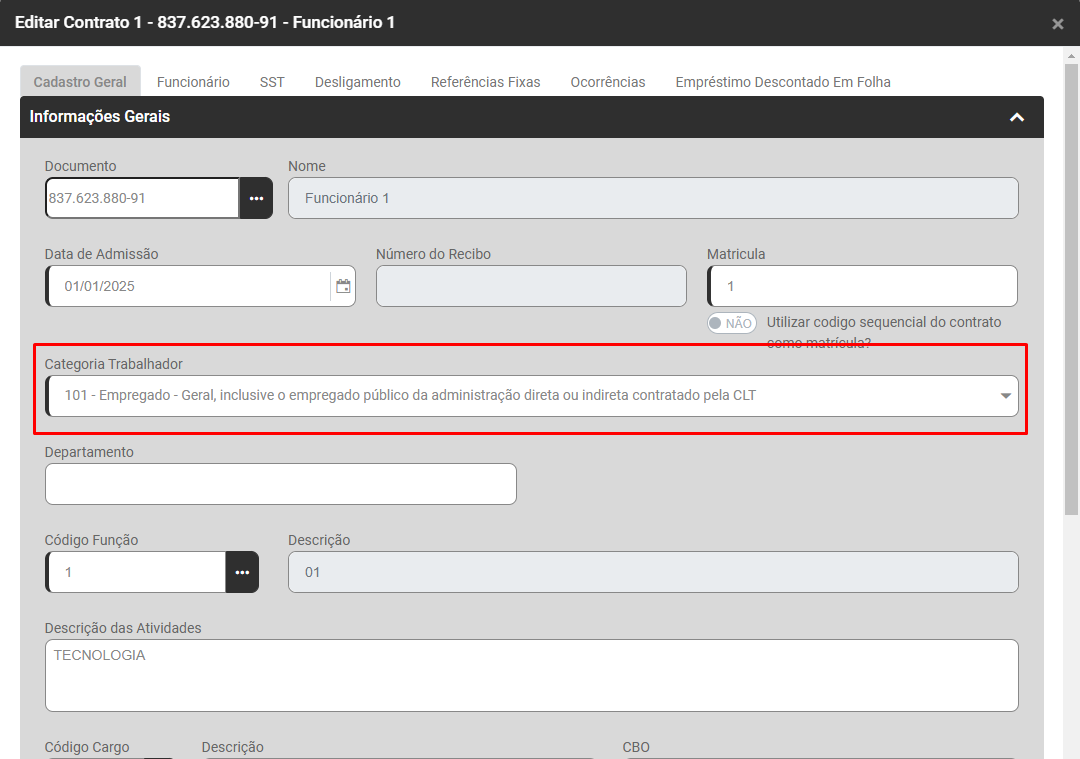 Edite os Dados Contratuais do Trabalhador que apresentou a inconsistência na aba Cadastro Geral>Informações Gerais - Campo Categoria do Trabalhador