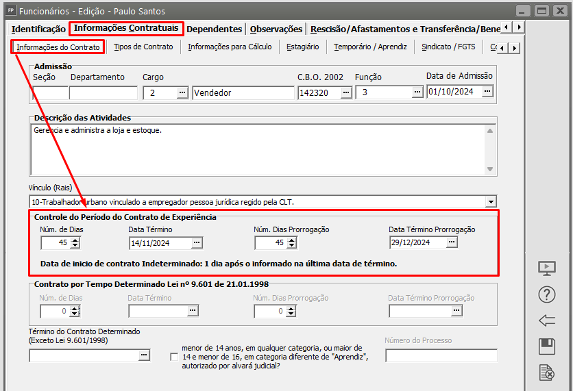 Ação Sugerida: Acesse o cadastro do funcionário verifique a aba Informações Contratuais > Informações do Contrato se foi preenchido os campos de Controle do Periodo do Contrato de Experiencia. Após a correção, salve e reenvie o s2200: