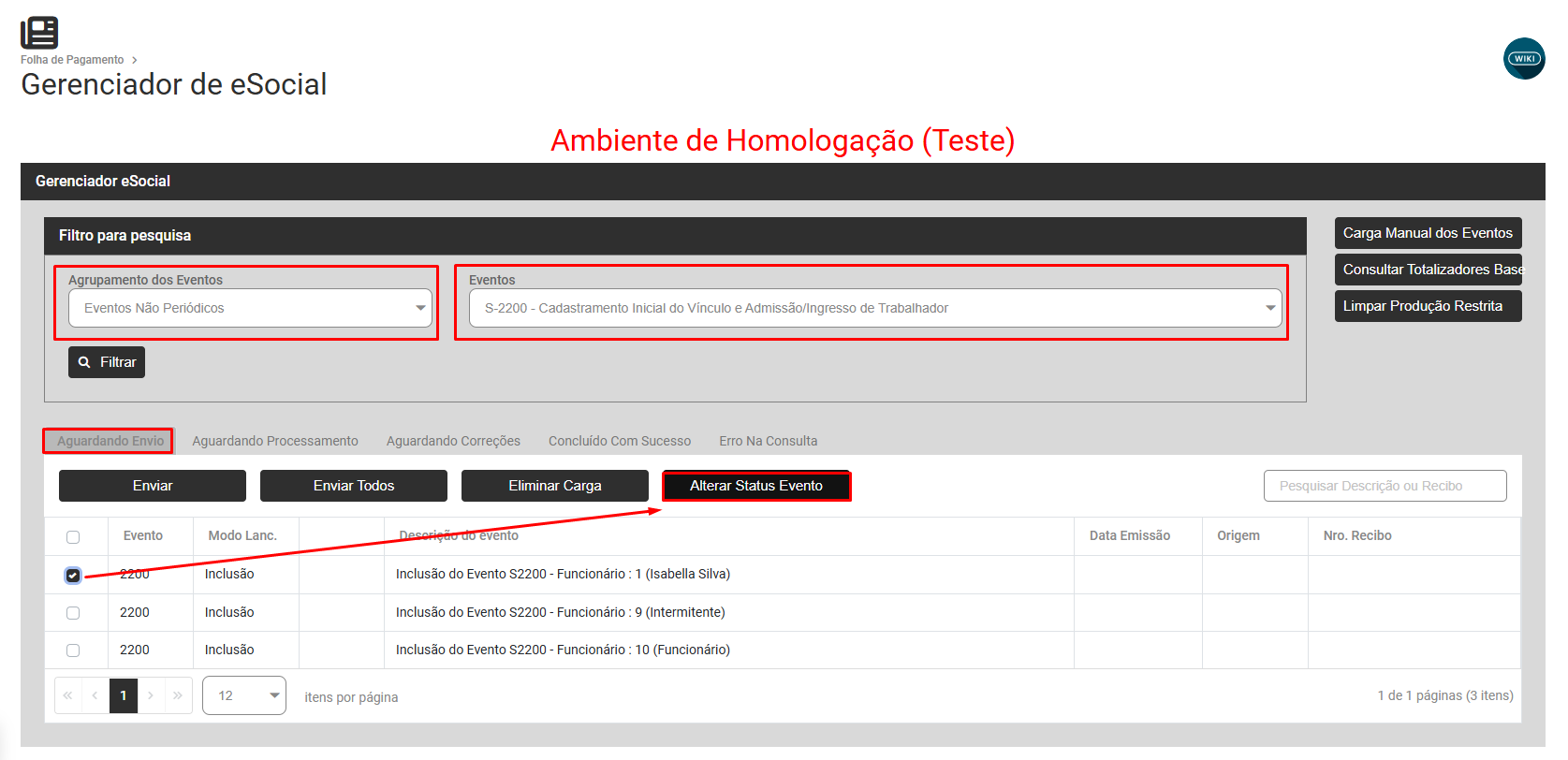 Filtre por Eventos Não Periódicos S2200 - Aguardando Correção, selecione o evento e clique em Alterar Status