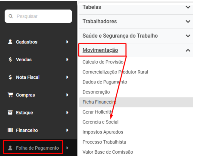 Em seguida acesse o menu Folha de Pagamento>Movimentação>Gerencia eSocial