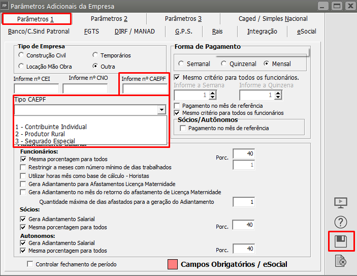 Como Corrigir: Acessar o menu Manutenção > Empresas > Parâmetros Adicionais da Empresa e na aba Parâmetros 1 preencha com o número do CAEPF e tipo do CAEPF para envio: