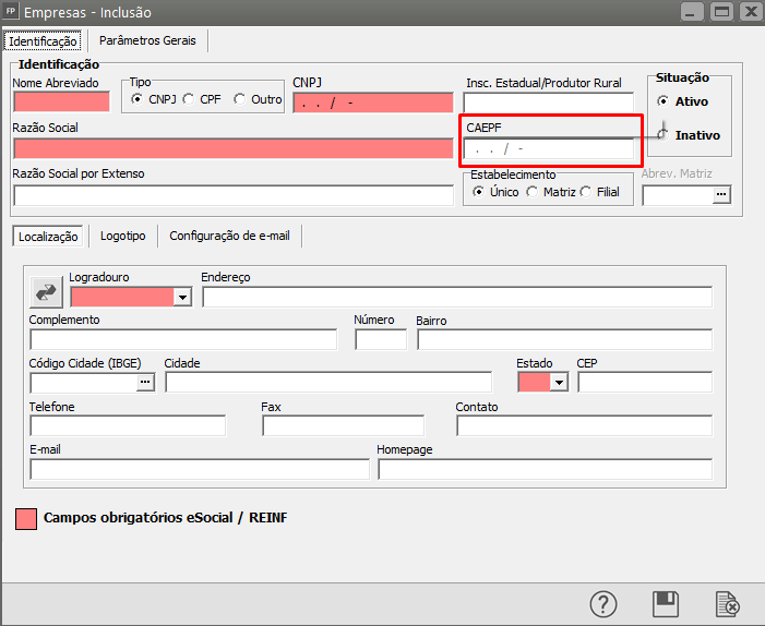 Acesse também: Manutenção > Empresas > Parâmetros Adicionais da Empresa e na aba Parâmetros 1 preencha com o número do CAEPF e tipo do CAEPF para envio: