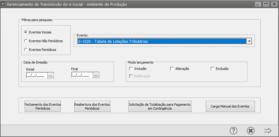 No campo Evento, selecione o evento S-1020 e clique na setinha Avança ou tecle F5.