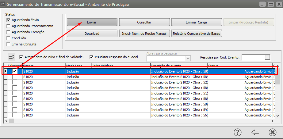 Selecione o evento S-1020 e clique no botão ENVIAR.