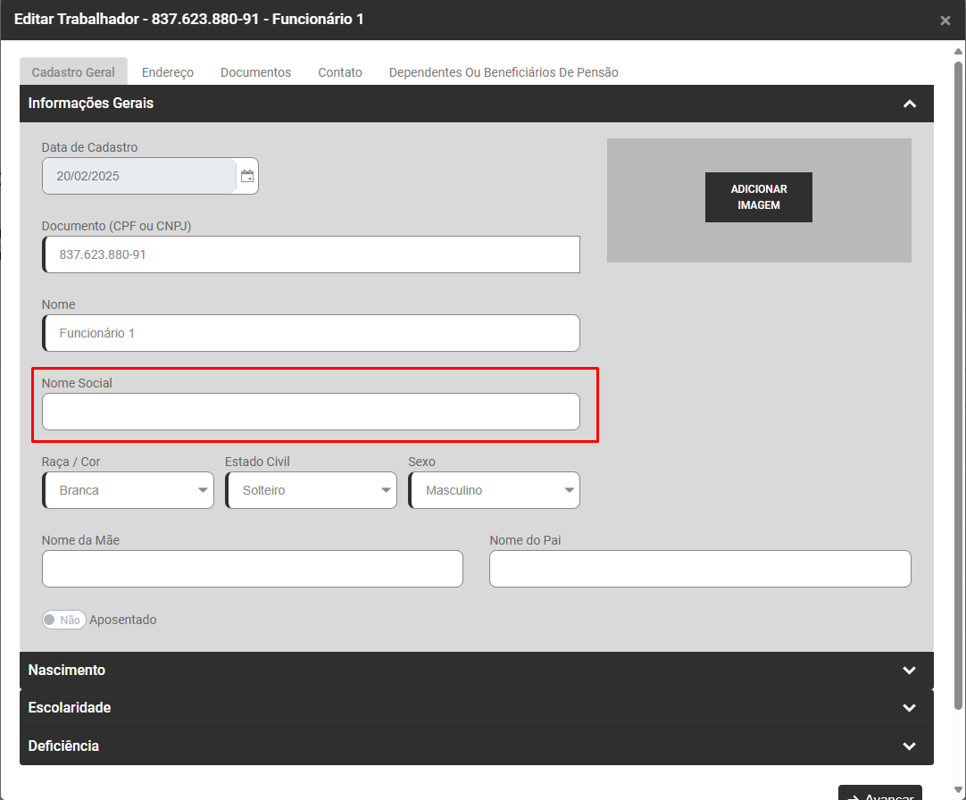 Edite os Dados Pessoais do Trabalhador que apresentou a inconsistência na aba Cadastro Geral>Informações Gerais - Campo Nome Social