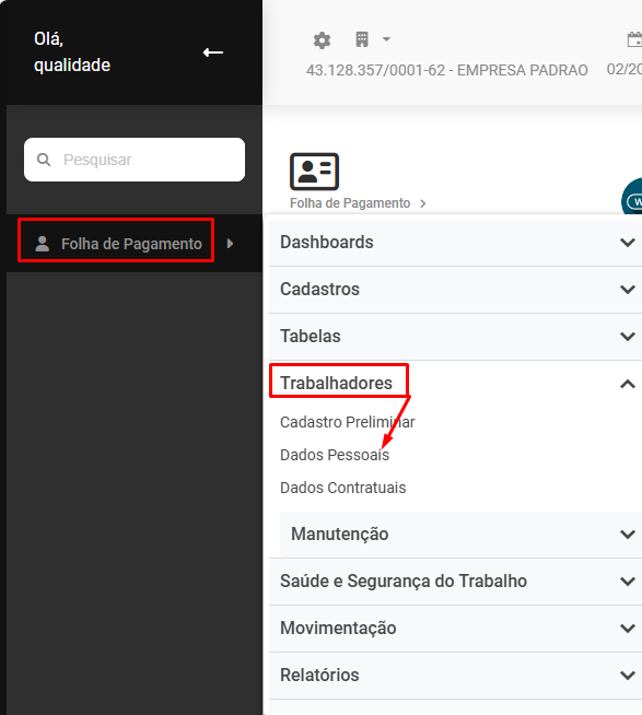 Correção: Acesse o menu Folha de Pagamento>Trabalhadores>Dados Pessoais