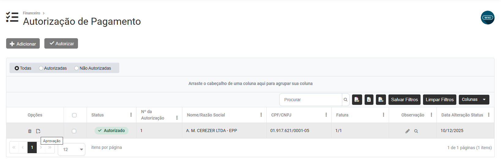 Neste momento o Sistema irá voltar para a tela com o Grid de informações e a Conta a Pagar que você autorizou o pagamento estará relacionada no Grid