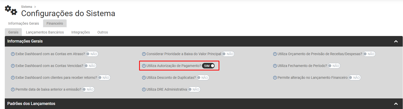Para que você utilize Autorização de Pagamento, deverá acessar as Configurações do Sistema Financeiro e no Campo Gerais>Informações Gerais, definir que Utiliza Autorização de Pagamento