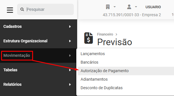Para realizar o cadastro da Autorização de Pagamento você deverá acessar o menu Movimentação>Autorização de Pagamento