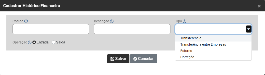 - Tipo - Informe o Tipo de Movimentação que será realizada na utilização deste histórico. Este campo não é de preenchimento obrigatório.