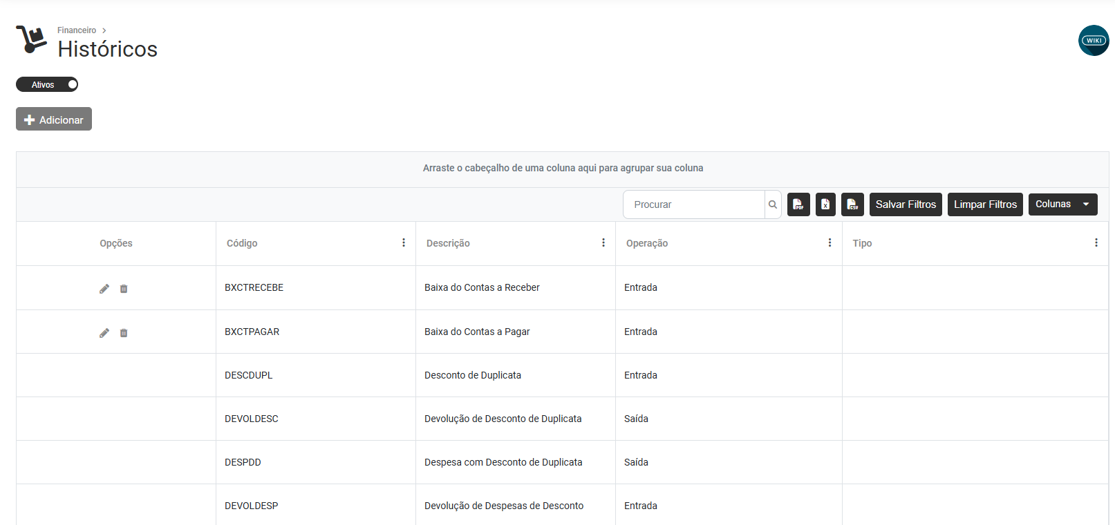 Não será possível realizar alterações ou exclusões para os Históricos internamente cadastrados pelo Sistema