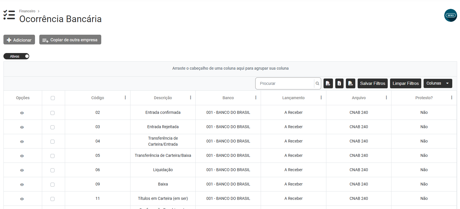 Ao clicar no Botão Copiar de Outra Empresa o Sistema apresentará a tela para que você defina quais as ocorrências bancárias que deverão ser copiadas