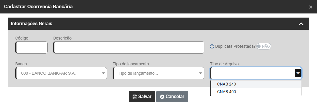 Cadastro de Ocorrências Bancárias