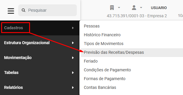 Para realizar o Cadastro de Previsão das Receitas e Despesas acesse o menu Cadastros>Previsão das Receitas e Despesas