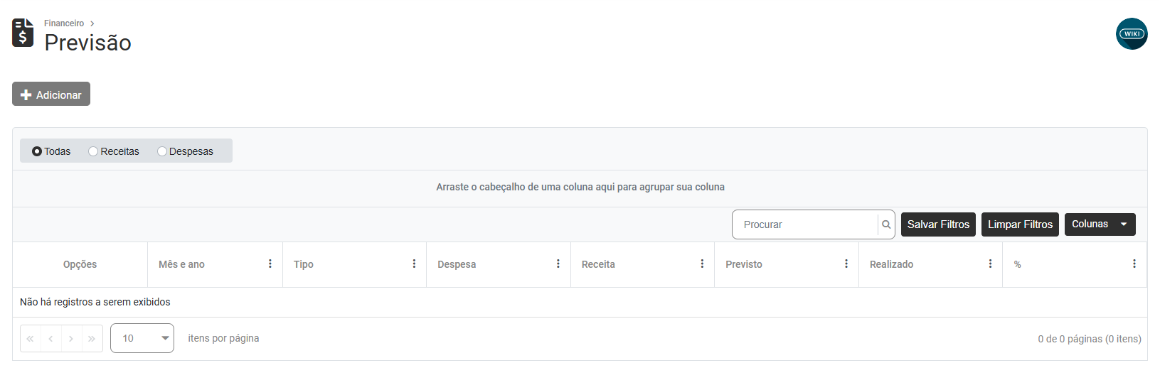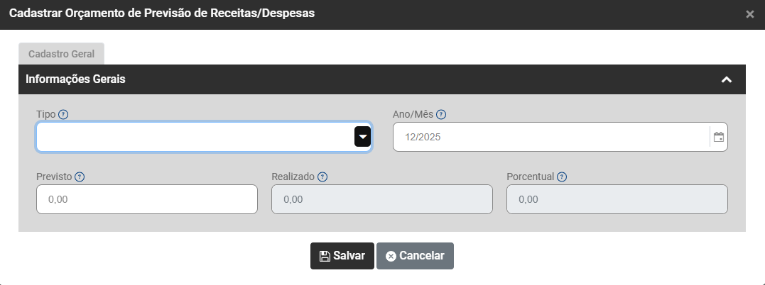 Ao acessar o botão Adicionar será apresentada a tela para que você faça o cadastro da Previsão de Receita ou Despesa do período, informe