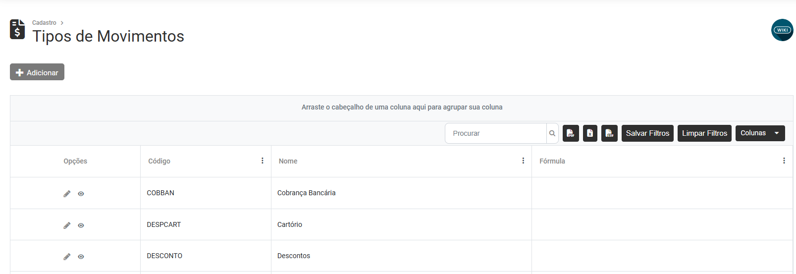 Será apresentada a tela contendo o Grid com os cadastros dos Tipos de Movimento, contendo as colunas: