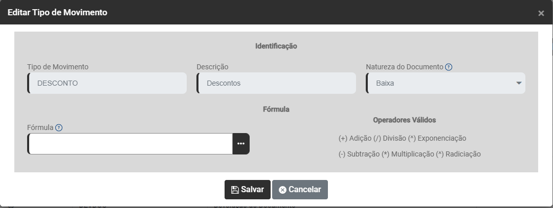 Você também terá Operadores Válidos para a definição de fórmulas - Adição, Divisão, Exponenciação, Subtração, Multiplicação e Radiciação