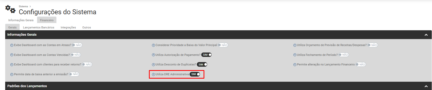 Para que você consiga utilizar a Demonstração de Resultado Administrativa deverá acessar o menu Configurações do Financeiro e na aba Gerais - Campo Informações Gerais, definir Utiliza DRE Administrativa