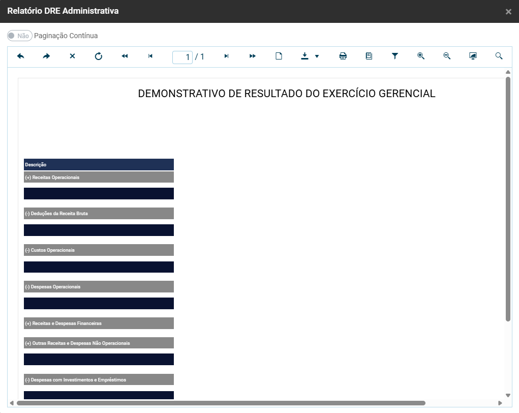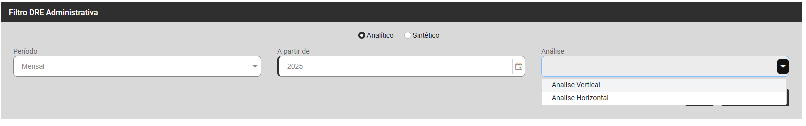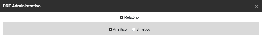 Clique em Imprimir Relatório e será apresentada a Tela da DRE Administrativa, defina Analítico ou Sintético