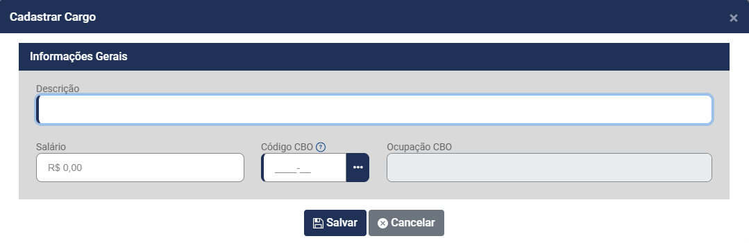 - Salário (campo não obrigatório, se for preenchido, no momento que o cargo for definido para um trabalhador, o campo salário será preenchido automaticamente, podendo ser alterado)