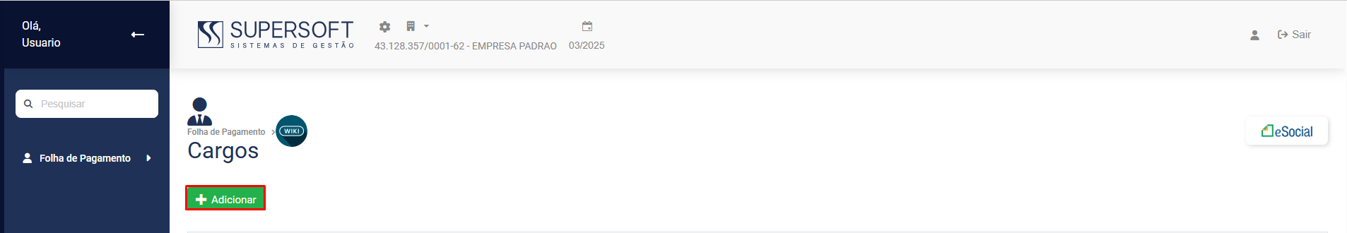 Será apresentada a tela de cadastro de Cargo, clique em Adicionar