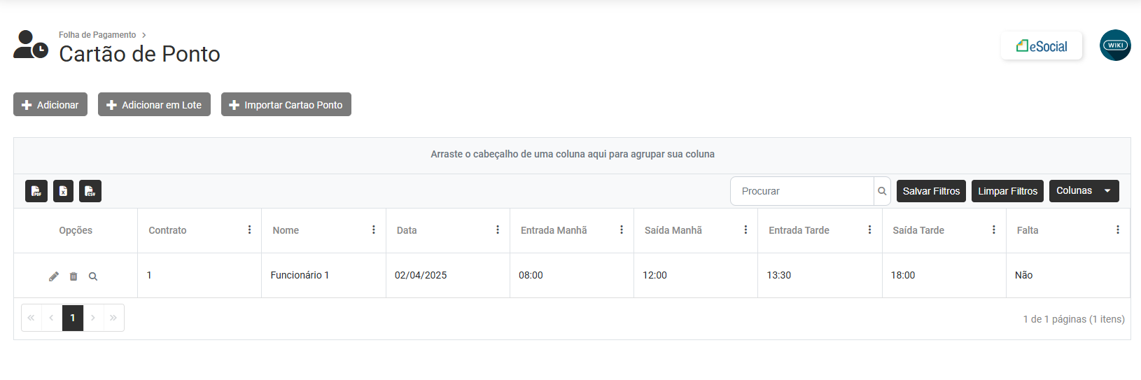 Para cadastrar um novo Cartão Ponto, acesse o botão Adicionar, existente na parte superior da tela