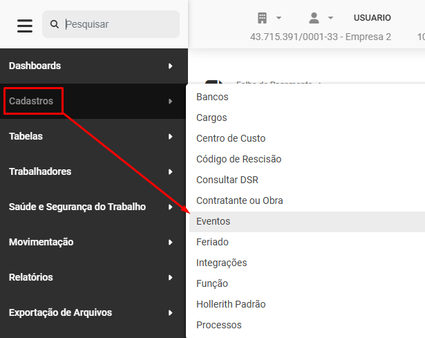 Para que você visualize, edite ou exclua eventos no Módulo Folha de Pagamento, acesse o menu Cadastros>Eventos