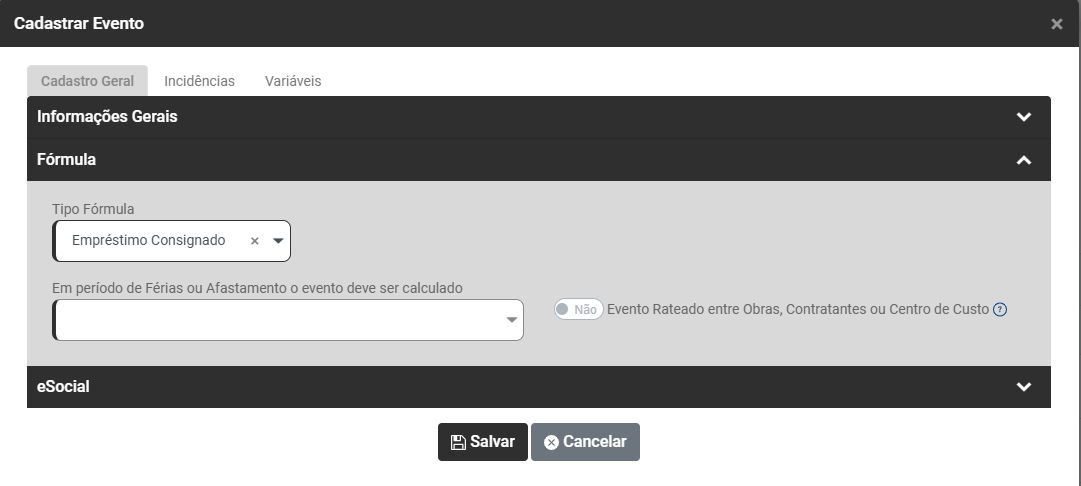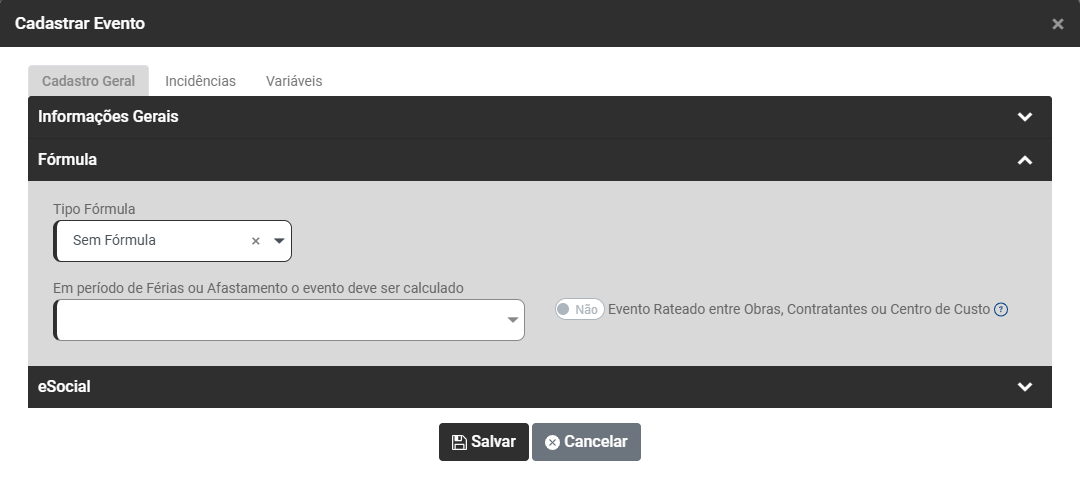 b) Com Fórmula - Será necessário o cadastro de uma fórmula para o cálculo do Evento que poderá utilizar variáveis ou referências em seus cálculos,