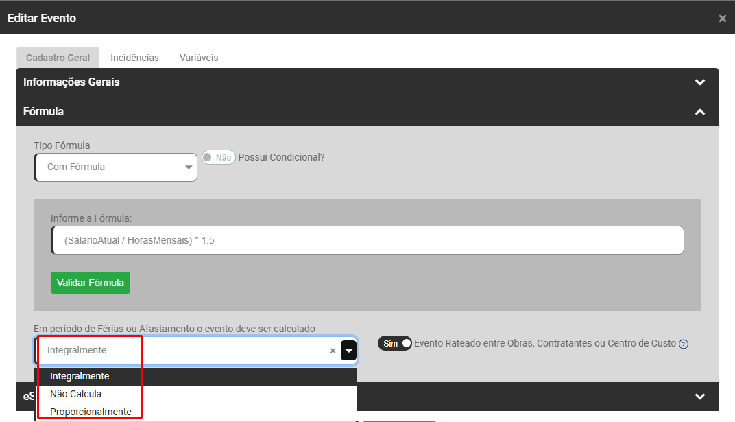 Defina se em período de Férias ou Afastamento o evento deve ser calculado e se o Evento será rateado entre Obras, Contratantes ou Centro de Custo 9Se o tipo de sua empresa for Construção Civil ou Locação de Mão de Obra e você utilizar rateio por tomadores, este item informará ao sistema para ratear o evento por tomadores)