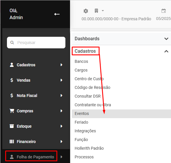 Para que você visualize, edite ou exclua eventos no Módulo Folha de Pagamento, acesse o menu Folha de Pagamento>Cadastros>Eventos