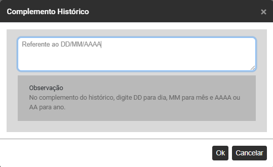 - Complemento do Histórico - Clique no desenho do "Olhinho" e será apresentada a tela para que você defina o Complemento do Histórico, nesta tela você conseguirá fazer com que o Módulo apresente a data de referência do lançamento, definindo dia, mês e ano ou apenas mês e ano.