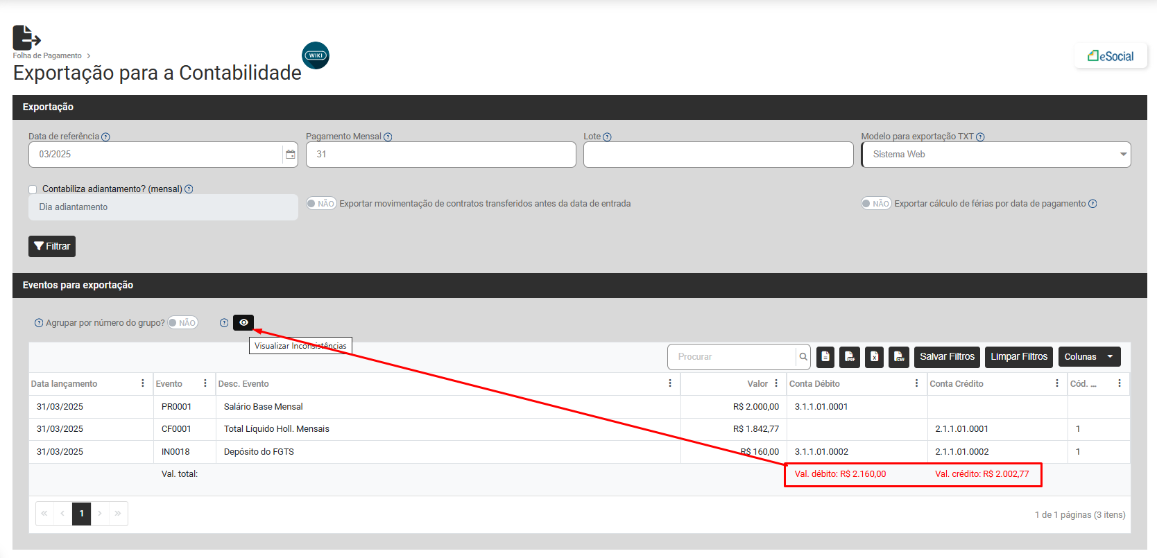 - Clique em Filtrar para que o Módulo apresente a Planilha Contábil para a conferência das informações