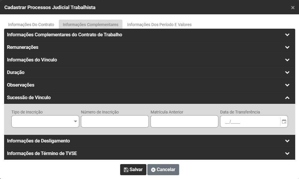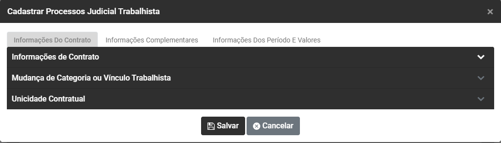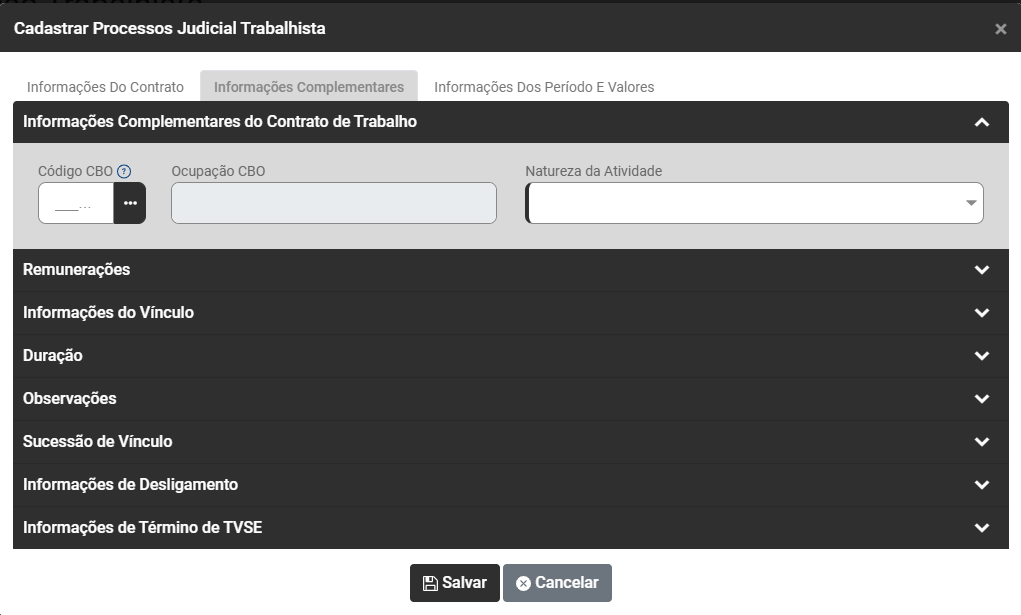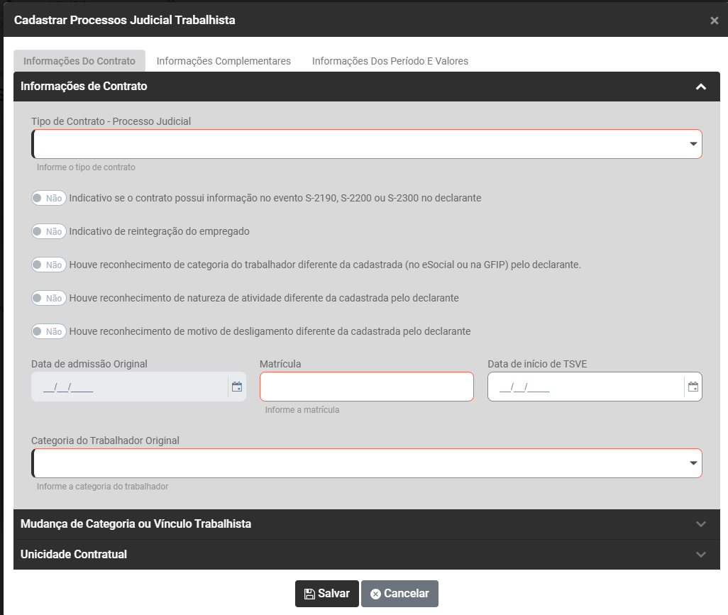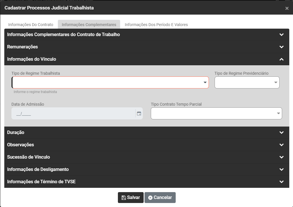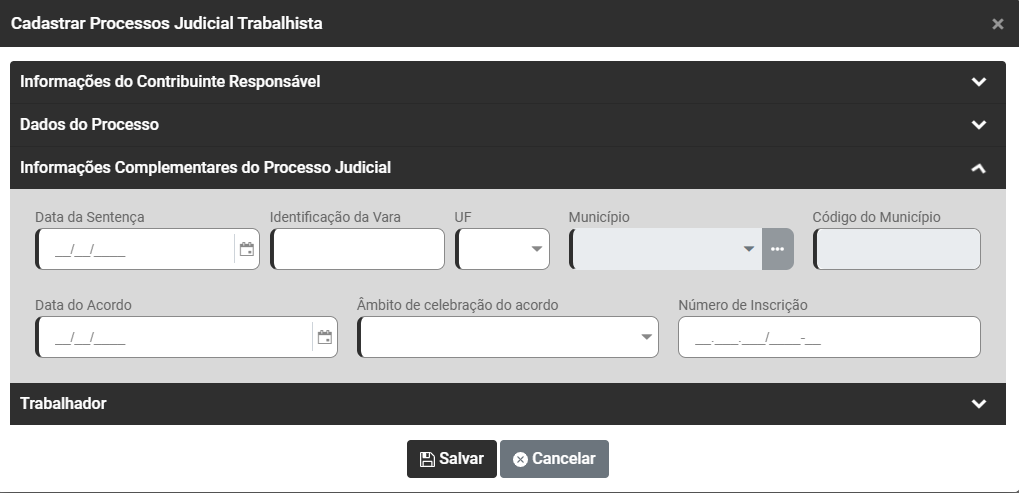 Ao acessar o botão Adicionar será apresentada a tela para cadastro do Processo Trabalhista, com as seguintes informações para serem cadastradas:
