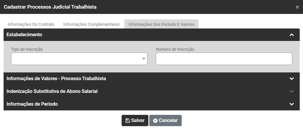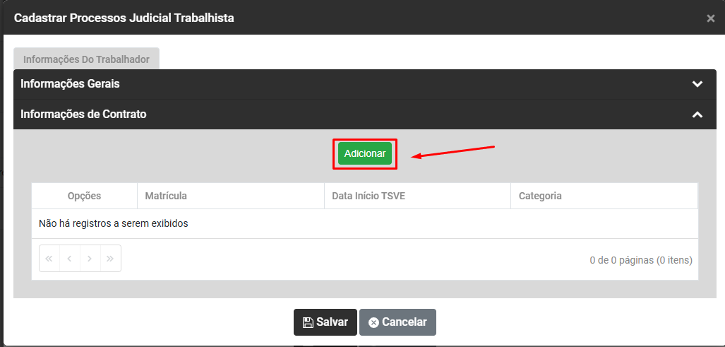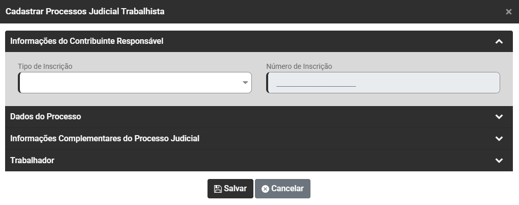 Ao clicar em Adicionar será apresentada a tela para Cadastrar Processo Judicial Trabalhista