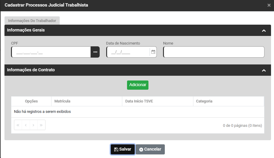 Clique no botão Adicionar para informar os Trabalhadores relacionados ao Processo Trabalhista que está sendo cadastrado, informe