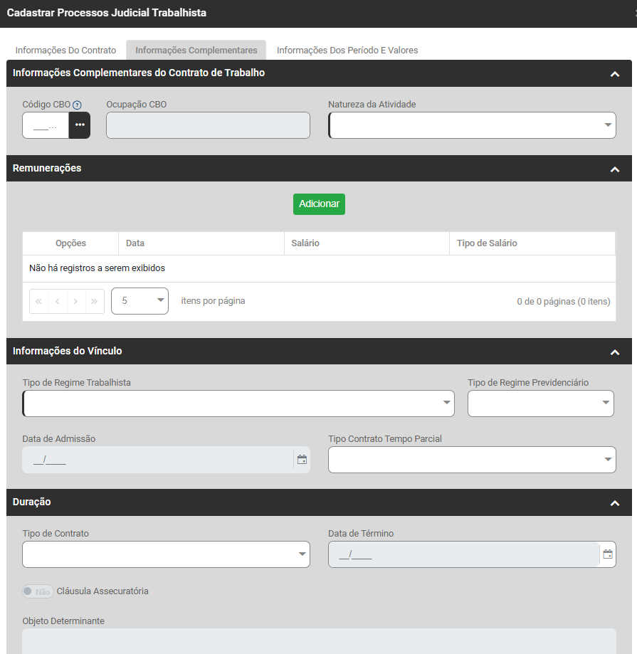 Ao acessar o botão Adicionar será apresentada a tela para cadastro do Processo Trabalhista, com as seguintes informações para serem cadastradas: